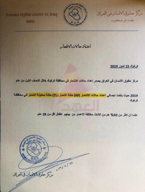 بەپێی بەڵگەنامەیەك كە لەلایەن ناوەندی مافەكانی مرۆڤ لە عیراق دەرچووە ، لەماوەی شەش مانگی یەكەمی ساڵی 2019، حاڵەتەكانی خۆكوشتن لە پارێزگای كەركوك كەیشتوونەتە 69 حاڵەت.